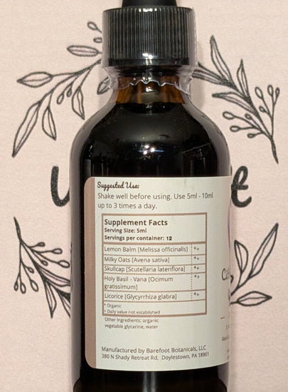 A blend of Lemon Balm, Milky Oats, Skullcap, and Holy Basil, with a touch of Licorice Root.