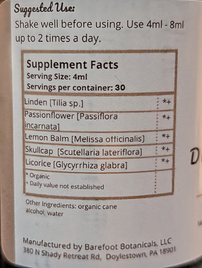 A blend of Linden, Passionflower, Lemon Balm, Skullcap, with a touch of Licorice Root.